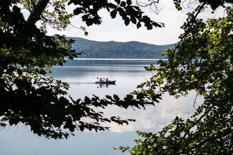 Keywords: canoeing kayak lake paddle water sport water sports boot leisure paddler kayakers canoeist holiday rest water surface maria laach laacher lake eifel vulkaneifel