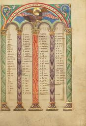 | Keywords: Canon Table Page - Google Art Project (6806932).jpg  None 430703 Unknown /collection/the-j-paul-getty-museum/artwork/canon-table-page-unknown/6806932/ Unknown illuminator /collection/the-j-paul-getty-museum/ The J Paul Getty Museum 343005 http //www getty edu/museum 3/12/2012 5 15 51 PM /collection/the-j-paul-getty-museum/artwork/canon-table-page-unknown/6806932/ 1120 about 1120 - 1140 Eagles Saint John the Evangelist Tempera colors gold and silver on parchment 229 6806932 True 1140 3/25/2012 9 28 41 AM lido getty edu-gm-obj110049 http //www getty edu/art/gettyguide/artObjectDetails artobj 110049 http //www getty edu/legal/copyright html Folio 1120 1150 Helmarshausen Germany Creation w165 x h229 cm about 1120 - 1140 False 0 68359375 Part canon-table-page-unknown Canon Table Page c 165 Tempera colors gold and silver on parchment Eagles Saint John the Evangelist http //www getty edu/legal/copyright html special url_id PgHjADdvB8NJ6A PD-old-100 MS LUDWIG II 3 Getty museum - Gospel book from Helmarshausen Canon tables Google Art Project works by unknown artist Eagle of Saint John the Evangelist in miniatures |