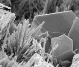 Keywords: CaOH2SEM.jpg en Scanning electron microscopy image of fracture surfaces of hardened cement paste showing plates of calcium hydroxide and needles of ettringite micron scale http //www fhwa dot gov/publications/research/infrastructure/pavements/pccp/04150/chapt14 cfm US Department of Transportation PD-USGov Calcium compounds |