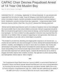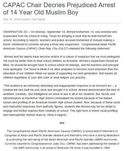 | Keywords: CAPAC Chair Decries Prejudiced Arrest of 14 Year Old Muslim Boy.jpg CAPAC Chair Decries Prejudiced Arrest of 14 Year Old Muslim Boy Sep 16 2015 Issues Civil Rights WASHINGTON DC “ On Monday September 14 Ahmed Mohamed 14 was arrested and suspended from his school in Irving Texas for bringing a clock that he built himself into school According to reports teachers and police accused Mohamed of instead making a bomb Mohamed is currently serving a three-day suspension Congressional Asian Pacific American Caucus CAPAC Chair Rep Chu CA-27 released the following statement Ahmed and his talents have become victims of a culture of suspicion that we must extinguish We must be better than to treat school children as terrorists Ahmed ™s suspension should be lifted he should be brought back to school where he belongs and his teachers and principal must apologize Our future is bleak if we allow prejudice to become more important than the education of our children When we speak of supporting our next generation that means all children regardless of your skin color or what religion you practice This incident is an extremely disturbing and inappropriate response to an innocent act -- a creative kid who built his own clock and brought it to school Ahmed demonstrated the kind of ambition creativity and intelligence we strive to see in all of our students But faculty and administrators at MacArthur High School criminalized his actions because of the blatant racism and profiling of an American Muslim high school student Now because of these racist and mistrustful responses from authority figures students like Ahmed may be too afraid to engage and further express their creativity at school This right here is where racial profiling and Islamophobic rhetoric lead us What a tragedy The Congressional Asian Pacific American Caucus CAPAC is comprised of Members of Congress of Asian and Pacific Islander descent and Members who have a strong dedication to promoting the well-being of the Asian American and Pacific Islander AAPI community Currently chaired by Congresswoman Judy Chu CAPAC has been addressing the needs of the AAPI community in all areas of American life since it was founded in 1994 https //capac-chu house gov/press-release/capac-chair-decries-prejudiced-arrest-14-year-old-muslim-boy house gov archived at https //web archive org/web/20150921193607/https //capac-chu house gov/press-release/capac-chair-decries-prejudiced-arrest-14-year-old-muslim-boy Internet Archive 2015-09-16 Congressional Asian Pacific American Caucus CAPAC PD-US-Gov <br />Index gallery page at Ahmed Mohamed student Ahmed Mohamed clock incident PD-USGov |