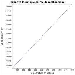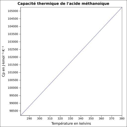 Keywords: Capacité thermique acide méthanoïque.svg fr Capacité thermique liquide calculée d'après <br/> Robert H Perry et Donald W Green Perry's Chemical Engineers' Handbook McGraw-Hill USA 1997 7e éd 2400 p ISBN 0-07-049841-5 p 2-170 own Epop 2010-06-28 Created with Gnumeric Heat capacity |