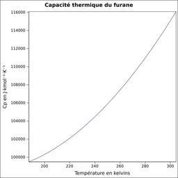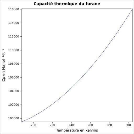 Keywords: Capacité thermique furane.svg fr Capacité thermique liquide calculée d'après <br/> Robert H Perry et Donald W Green Perry's Chemical Engineers' Handbook McGraw-Hill USA 1997 7e éd 2400 p ISBN 0-07-049841-5 p 2-170 own Epop 2010-06-28 Created with Gnumeric Heat capacity |