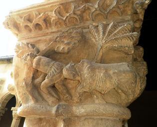 Keywords: CapitelN18.JPG en 18th capital in northern corridor of Santa Maria la Real de Nieva church Segovia province Spain Bull fight scene es 18º capitel de la galería norte del claustro de la iglesia de Santa María la Real de Nieva en la provincia de Segovia España Hombre corneado por un toro que está siendo lanceado por un caballero en la otra cara own Osado 2010 Capitals of the Cloister of Santa María la Real de Nieva Bulls in art |