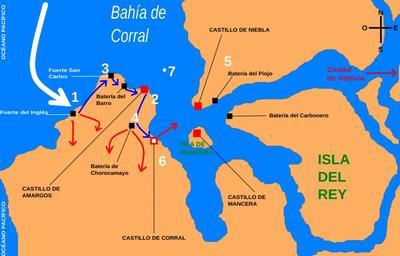 | Keywords: Capture of Valdivia-es.svg Map of the capture of Valdivia during the Chilean War of Independece Español tomado de es Toma de Valdivia Simbología En color rojo Castillos del sistema de defensa de Valdivia En color negro Baterías y reductos menores del sistema de defensa Líneas blancas movimiento de la escuadra chilena Líneas azules movimiento de las fuerzas patriotas Líneas rojas desbande y huida de las fuerzas realistas Punto 1 Desembarco de las fuerzas patriota al mando del Mayor Miller Punto 2 Ruta terrestre del Mayor Beauchef y Miller Punto 3 Navegación del Intrépido y la Moctezuma hacia Corral El Intrépido vara Punto 4 Huida de las fuerzas realistas Punto 5 Rendición de los fuertes de la ribera norte Punto 6 Lord Cochrane se reúne con sus tropas en Corral Punto 7 La fragata O'Higgins avanza por la bahía de Valdivia Own November the 3rd 2007 Original by Valo3 ; vectorized by ZStardust Mapatomadevaldivia PNG Translation possible Valdivia Maps of the history of Chile SVG maps showing history in Spanish |