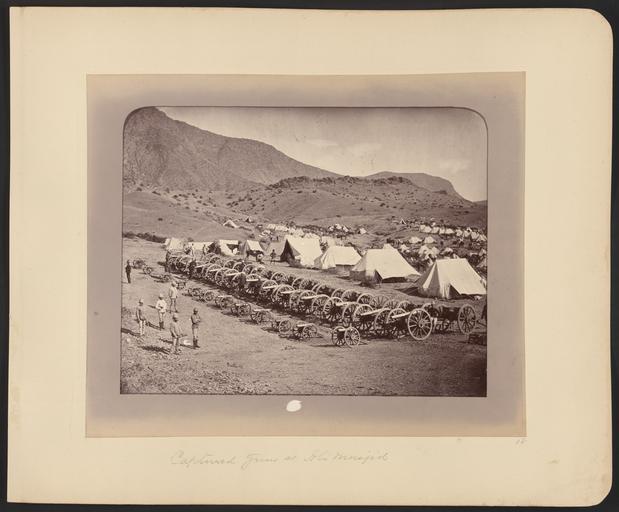 Keywords: Captured Guns at Ali Masjid WDL11474.png Artwork ru Бе к Джон уме в 1900 году fr Burke John mort en 1900 en Burke John died 1900 zh 约翰·伯克,卒于 1900 年 pt Burke John falecido em 1900 ar بيرك، جون، توفي 1900 es Burke John fallecido en 1900 ru О удия захваченные возле Али асджида fr Canons saisis à Ali Masjid en Captured Guns at Ali Masjid zh 阿里清 寺缴获的火炮 pt Artilharia capturada em Ali Masjid ar مدافع اُستُوليَ عليها في معركة مسجد علي ru Эта фотог афия а тилле ийских о удий захваченных б итанскими войсками в битве у Али асджида входит в альбом едких исто ических фотоснимков на кото ых изоб ажены люди и места связанные со Вто ой англо-афганской войной В с ажении состоявшемся в нояб е 1878 года б итанские и индийские войска под командованием гене ала сэ а Сэмюэля Б ауна 1824 1901 гг оде жали победу над афганской а мией и воинами из афганских племен под п едводительством Голям Хайде -хана Войска гене ала Б ауна захватили к епость у Али асджида и стали п одвигаться к Кабулу вынудив афганского эми а Ши -Али-хана 1825 1879 гг бежать из ст аны в безуспешной попытке за учиться подде жкой России Позади 36 захваченных о удий азного калиб а видны палатки б итанского лаге я и лошади п инадлежащие б итанской кавале ии Вто ая англо-афганская война началась в нояб е 1878 года когда Великоб итания опасаясь как ей казалось астущего влияния России в Афганистане вто глась в эту ст ану с те ито ии Б итанской Индии Пе вый этап войны закончился в мае 1879 года подписанием Гандамакского догово а позволившего афганцам сох анить внут енний суве енитет однако заставившего их уступить конт оль над внешней политикой своей ст аны б итанцам Военные действия возобновились в сентяб е 1879 года после антиб итанского восстания в Кабуле и окончательно заве шились в сентяб е 1880 года ешающей битвой за Кандага Данный альбом включает по т еты б итанских и афганских лиде ов и военнослужащих фотог афии п остых афганских людей изоб ажения б итанских военных лаге ей военных действий ст оений пейзажей к упных и небольших го одов Все изоб аженные на фотоснимках места находятся на те ито ии сов еменных Афганистана или Пакистана в то в емя бывших частью Б итанской Индии Около т ети п едставленных в альбоме фотог афий выполнены Джоном Бе ком около 1843 1900 гг д угая т еть  сэ ом Бенджамином Симпсоном 1831 1923 гг а оставшаяся часть  несколькими д угими фотог афами Авто ы некото ых фотоснимков неизвестны Возможно что составителем альбома был один из членов б итанского п авительства в Индии однако это п едположение не подтве ждено Каким об азом альбом попал в Библиотеку Конг есса неизвестно <br>Афганские войны; Пушки; Великоб итания А мия; Военные лаге я; Солдаты; Палатки fr Ce cliché montrant les pièces d'artillerie capturées par les forces britanniques à la bataille d'Ali Masjid est extrait d'un album de photographies historiques rares de personnalités et de sites associés à la seconde guerre anglo-afghane Dans cette bataille qui se déroula en novembre 1878 une force britannique et indienne menée par le général sir Samuel Browne 1824 1901 remporta la victoire sur les tribus et l'armée afghanes dirigées par Gholam Hyder Khan Browne saisit le fort d'Ali Masjid puis il marcha vers Kaboul contraignant l'émir afghan Sher 'Alī Khān 1825 1879 à l'exil lors d'une tentative infructueuse visant à obtenir le soutien des Russes Sur la photographie les tentes du campement britannique et les chevaux d'une unité britannique sont visibles derrière les 36 canons de différents calibres capturés La seconde guerre anglo-afghane commença en novembre 1878 lorsque la Grande-Bretagne se sentant menacée par l'influence croissante des Russes en Afghanistan envahit le pays depuis l'Inde britannique La première phase de la guerre s'acheva en 1879 avec le traité de Gandamak qui permit aux Afghans de conserver leur souveraineté nationale mais les força à céder le contrôle de leur politique étrangère aux Britanniques Les combats reprirent en septembre 1879 à la suite d'un soulèvement antibritannique à Kaboul et ils se conclurent finalement 