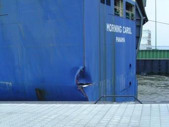 Keywords: Car carrier Morning Carol 2011-07-26 (3).jpg en While approaching the Kaiserschleuse ship lock in Bremerhaven the car carrier Morning Carol hit the quay of the entrance area of the lock The ship suffered a crack and a bump de Der Autotransporter Morning Carol berührte bei der Einfahrt in die Kaiserschleuse Bremerhaven unsanft die Kaimauer des Vorbereichs der Schleuse Das Schiff erlitt einen Riss und eine Beule own Tvabutzku1234 2011-07-26 53 33 23 76 N 8 33 33 92 E region DE_heading W Cc-zero Morning Carol ship 2008 Car carriers in Bremerhaven Damaged ships Kaiserschleuse Bremerhaven |