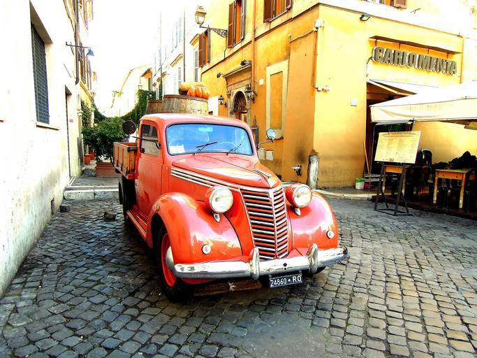 Keywords: car rome house on the road italy red truck car lights cobblestones road alley city tourism