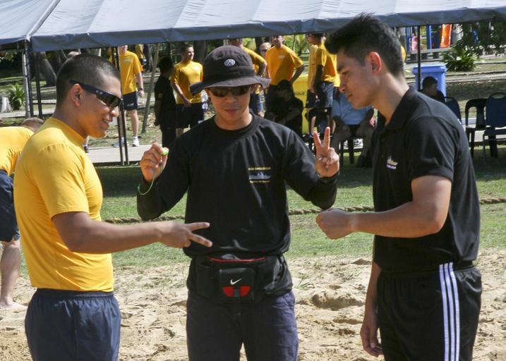 Keywords: CARAT 2012 121109-N-QU339-010.jpg en Rock paper scissors takes the place of a coin toss as U S Sailors from Guided Missile Frigate USS Reuben James and Royal Brunei Armed Forces shared some friendly competition during a sports day event Both countries competed in soccer softball football volleyball and tug-o-war Sports day came after the closing ceremony of the 18th annual Cooperation Afloat Readiness and Training exercise between the U S Navy and Royal Brunei armed forces CARAT is a series of bilateral military exercises between the U S Navy and the armed forces of Bangladesh Brunei Indonesia Malaysia the Philippines Singapore and Timor Leste CARAT Brunei has been part of the series since it began in 1995 The overarching goal of CARAT Brunei 2012 is to enhance regional capabilities and cooperation promote understanding and improve interoperability and readiness of participating forces 2012-11-09 FFG 57 https //www dvidshub net/image/782727 121109-N-QU339-010 2012-11-15 00 30 BN PD-USGov-Military-Navy Cooperation Afloat Readiness and Training 2012 Images from DoD uploaded by Fæ |