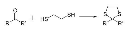 Keywords: Carbonyl-protection-with-ethanedithiol-2D.png Reaction scheme showing the protection of a carbonyl group by reaction with 1 2-ethanedithiol to form a 1 3-dithiolane Own 2007-07-08 Ben Mills Benjah-bmm27 Images by Ben Mills 1 3-dithiolanes Functional group protection |