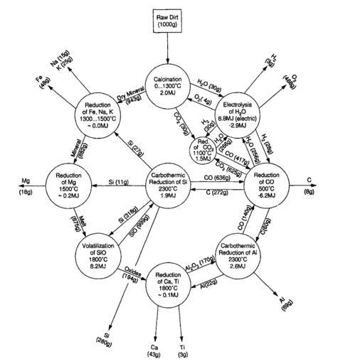 | Keywords: Carbothermal Reduction Process.PNG en Diagram showing cycle of chemical reduction process steps from raw dirt to reduced metals using carbon and high temperature Material Processing for Self-Assembling Machine Systems Los Alamos National Laboratory Report LA-UR-99-2690 Lackner Klaus S Butt Darryl P Wendt Christopher H 2000-12-13 PD-USGov Uncategorized 2014 June 7 |