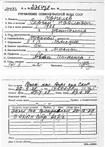 | View Original: | Card of the prisoner in the Office of the north-eastern camps of the NKVD with record about Korolev. June 17, 1942.png (688x968) | |||