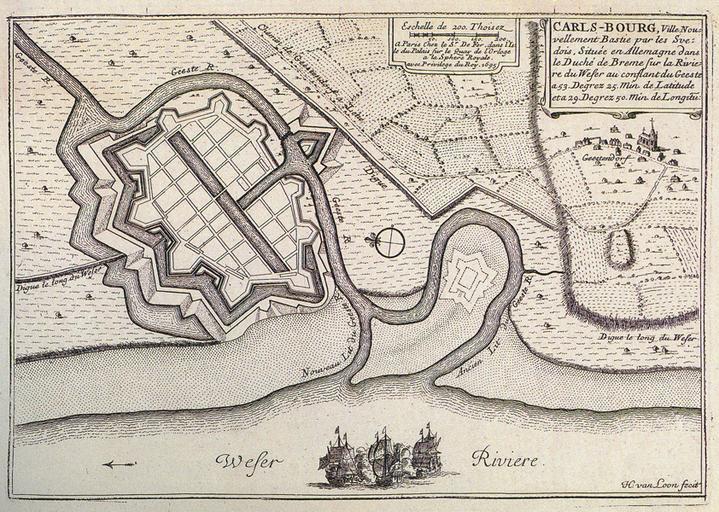 | Keywords: Carlsburg - Jean Mell - 1695.jpg en Map of swedish city / fortress of Carlsburg at the junction of the river Geeste with the river Weser The layout of the city was designed by Jean Mell around 1672 the copper engraving was made 1695 by Harmanus van Loon Right-hand the old fortification of the Leher Schanze can be seen de Karte der schwedischen Festungsstadt Carlsburg an der Mündung der Geeste in die Weser Den Entwurf für die Stadt fertigte Jean Mell um 1672 den Kupferstich Harmanus van Loon 1695 Auf der letzten Schleife der Geeste ist die ehemalige Befestigung der Leher Schanze zu sehen Herbert Schwarzwälder Bremen im 17 Jahrhundert Glanz und Elend einer Hansestadt Edition Temmen Bremen 1996 Harmanus van Loon 1695 PD-old-100 Carlsburg Lehe 17th-century fortress plans Germany in the 1670s Old maps of Lower Saxony Copper engravings Sweden 1611-1718 Maps of Weser Historical maps of Bremerhaven |