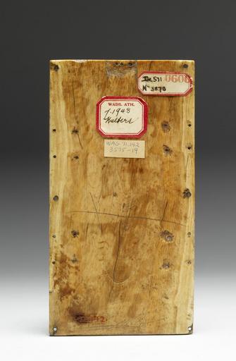 Keywords: Carolingian - Book-Cover Plaque with the Crucifixion and Holy Women at the Tomb - Walters 71142 - Back.jpg In the upper scene the crucified Christ is flanked by the Virgin St John and the Roman soldiers Longinus and Stephaton A coiled serpent symbolizing conquered evil wraps its tongue around the base of the cross Below the Holy Women are greeted by an angel at the empty tomb of Christ carved to look like the Holy Sepulcher the site of Christ's burial in Jerusalem This Carolingian ivory with its animated figures and fluid drapery dates to the reign of Charles the Bald grandson of Charlemagne ca 870 880 Medieval ivory cm 16 5 8 7 0 7 accession number 71 142 23524 Said to be from the Abbey of Maroilles Picardy Augustin Lambert Paris date and mode of acquisition unknown Henri Daguerre Paris date and mode of acquisition unknown Henry Walters city Baltimore Walters Art Museum Henry Walters Acquired by Henry Walters 1926 Art of the Dark Ages Worcester Art Museum Worcester 1937 The Dark Ages Worcester Art Museum Worcester 1937 The Life of Christ Wadsworth Atheneum Museum of Art Hartford 1948 The History of Bookbinding 525-1950 A D Baltimore Museum of Art Baltimore 1957-1958 Ivory The Sumptuous Art The Walters Art Gallery Baltimore 1983-1984 Vive la France French Treasures from the Middle Ages to Monet The Walters Art Gallery Baltimore 1999-2000 place of origin north France Walters Art Museum license Medieval ivory in the Walters Art Museum Carolingians Media contributed by the Walters Art Museum needs category review Vive la France French Treasures from the Middle Ages to Monet |