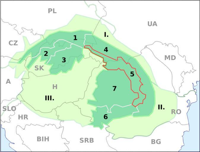 | Keywords: Carpathians Eastern Inner.svg Inner Eastern Carpathians outlined in red <br> 1 Outer Western Carpathians <br> 2 Central Western Carpathians <br> 3 Inner Western Carpathians <br> 4 Outer Eastern Carpathians <br> 5 Inner Eastern Carpathians <br>6 Southern Carpathians <br> 7 Apuseni West-Romanian Mountains and Transylvanian Plateau <br> I Subcarpathian depressions <br> II Romanian Lowlands <br> III Pannonian Basin <br>----<br> Wewnętrzne Karpaty Wschodnie w czerwonym konturze <br> 1 Zewnętrzne Karpaty Zachodnie <br> 2 Centralne Karpaty Zachodnie <br>3 Wewnętrzne Karpaty Zachodnie <br> 4 Zewnętrzne Karpaty Wschodnie <br> 5 Wewnętrzne Karpaty Wschodnie <br> 6 Karpaty Południowe <br> 7 Góry Zachodniorumuńskie i Wyżyna Transylwańska <br> I Podkarpacie <br> II Równiny Południoworumuńskie <br> III Kotlina Panońska Own PM / P 13 IX 2009 pl Polish language Wikipedia P SVG maps of Europe Maps of the Carpathian Mountains |