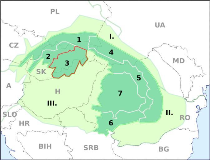 | Keywords: Carpathians Western Inner.svg Inner Western Carpathians outlined in red <br> 1 Outer Western Carpathians <br> 2 Central Western Carpathians <br> 3 Inner Western Carpathians <br> 4 Outer Eastern Carpathians <br> 5 Inner Eastern Carpathians <br>6 Southern Carpathians <br> 7 Apuseni West-Romanian Mountains and Transylvanian Plateau <br> I Subcarpathian depressions <br> II Romanian Lowlands <br> III Pannonian Basin <br>----<br> Wewnętrzne Karpaty Zachodnie w czerwonym konturze <br> 1 Zewnętrzne Karpaty Zachodnie <br> 2 Centralne Karpaty Zachodnie <br>3 Wewnętrzne Karpaty Zachodnie <br> 4 Zewnętrzne Karpaty Wschodnie <br> 5 Wewnętrzne Karpaty Wschodnie <br> 6 Karpaty Południowe <br> 7 Góry Zachodniorumuńskie i Wyżyna Transylwańska <br> I Podkarpacie <br> II Równiny Południoworumuńskie <br> III Kotlina Panońska Own PM / P 13 IX 2009 pl Polish language Wikipedia P SVG maps of Europe Maps of the Inner Western Carpathians |