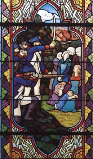 Keywords: Carrefour des chats.jpg en Stained glass window of the Saint-Martin church in La-Salle-de-Vihiers presenting the massacre of Carrefour-des-chats in 1794 when the French republican army shot over thirty villagers including women and children fr Église de La-Salle-de-Vihiers Maine-et-Loire France Vitrerie de Desjardins entre 1931 et 1939 Fusillade d'une trentaine d'habitants par les républicains au Carrefour des Chats http //www loire-france com/histoire/guerres-vendee/vitraux/galerie/pages/vitrail-096 htm Desjardins 1931 The picture represents a work of art whose author died over 70 years ago cca 1934 PD-old La Salle-de-Vihiers Colonnes infernales War of Vendée on stained glass windows Stained glass windows in Maine-et-Loire 1931 stained glass windows |