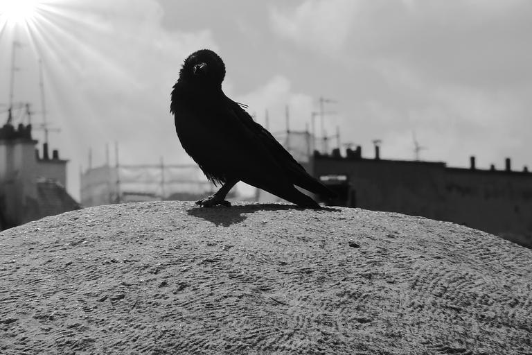 Keywords: carrion crow birds bird crow raven bird sit animal animals stone back light sun sunbeam roofs city silhouette silhouettes homes light black and white sky