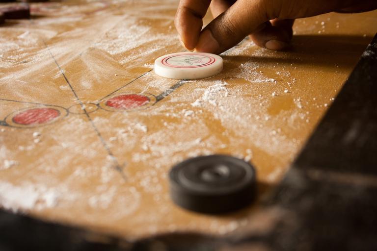 Keywords: carrom karrom table game game pieces coins hitting striker