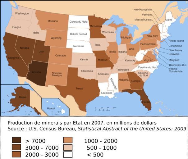 | Keywords: Carte minerais USA 2007.svg fr Carte de la production de minerais aux Etats-Unis en 2007 en valeur Carte de la production de minerais hors hydrocarbures aux Etats-Unis par Etat en 2007 Source U S Census Bureau Statistical Abstract of the United States 2009 http //www census gov/compendia/statab/2009edition html Section Natural Resources Own Urban 2009-04-23 Economic maps of the United States | ||||