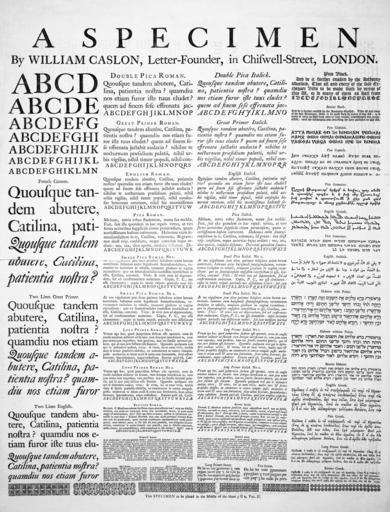 | Keywords: Caslon-schriftmusterblatt (cleaned).jpeg A specimen sheet of typefaces and languages by William Caslon I letter founder; from the 1728 en Cyclopaedia Schriftmusterblatt der Schriftgiesserei von William Caslon http //images library wisc edu/HistSciTech/EFacs/Cyclopaedia/Cyclopaedia02/XL/0089 jpg uploaded to the English Wikipedia by Janke as Image Caslonsample jpg probably deleted soon 16 26 23 March 2006 1728 or earlier William Caslon PD <gallery> File Caslon-schriftmusterblatt jpeg Originalv ersion </gallery> Derivative work This image has been cleaned from File Caslon-schriftmusterblatt jpeg by Notwist Cleaning operations Black and white Contrast and brightness altered Some spots removed with clone stamp PD-old-100 Sample texts used Most of the texts have typographical errors preserved in their transcriptions here Square brackets contain differences between multiple occurences of the same sample text ; Latin text Ciceronis Oratio in Catilinam Prima; §§ 1 3 5 7 9 <sup> at wikisource </sup> Quousque tandem abutêre Catilina patientia nostra quamdiu nos etiam furor iste tuus eludet quem ad finem sese effrenata jactabit audacia nihilne te nocturnum præsidium palatii nihil urbis vigiliæ nihil timor populi nihil consensus bonorum omnium nihil hic munitissimus habendi se- Melium novis rebus studentem manu sua occîdit Fuit fuit ista quondam in hac repub virtus ut viri fortes acrioribus suppliciis civem perniciosum quam acerbissimum hostem coërcerent Habemus enim senatusconsultum in te Catilina vehemens grave non deest reip consilium neque autoritas hujus ordinis nos nos dico aperte consules desumus Decrevit quondam senatus At nos vigesimum jam diem patimur hebescere aciem horum autoritatis habemus enim hujusmodi senatusconsultum verumtamen inclusum in tabulis tanquam gladium in vagina reconditum quo ex senatusconsulto confestim interfectum te esse Catilina convenit Vivis vivis non ad deponendam sed ad confirmandam audaciam Cupio P C me esse clementem cupio in tantis reipub periculis non dissolutum videri sed jam meipsum inertiæ Verum ego hoc quod jampridem factum esse oportuit certa de caussa nondum adducor ut faciam tum denique interficiam te cum jam nemo tam improbus tam perditus tam tui similis inveniri poterit qui id non jure factum esse fateatur Quamdiu quisquam erit qui te defendere audeat vives vives ita ut nunc vivis multis meis firmis præsidiis obsessus ne commovere te contra rempub possis multorum te etiam oculi aures non sentientem sicut adhuc fecerunt speculabuntur atque custodient Etenim quid est Catilina quod jam amplius exspectes Novemb C Manlium audaciæ satellitem atque administrum tuæ num me fefellit Catilina non modo res tanta tam atrox tam incredibilis verum id quod multo magis est admirandum dies Dixi ego idem in senatu cædem te optimatum contulisse in ante diem v Kalend Novemb tum cum multi principes civitatis Rom non tam sui conservandi quam tuorum consiliorum reprimendorum caussa profugerunt num inficiari potes te illo ipso die meis præsidiis mea diligentia circumclusum commovere te contra rempub non potuisse; cum tu discessu ceterorum nostra tamen qui remansissemus cæde contentum te esse dicebas Quid cum te Præneste Kalend ipsis Novembris occupaturum nocturno O dii immortales ubi-nam gentium sumus quam rempub habemus in qua urbe vivimus hic hic sunt in nostro numero P C in hoc orbis terræ sanctissimo gravissimoque consilio qui de meo nostrumque omnium interitu qui de hujus urbis atque adeo orbis terrarum exitio cogitent hosce ego video consul de republica sententiam rogo quos ferro trucidari oportebat eos nondum voce vulnero Fuisti igitur apud Leccam ea nocte Catilina distribuisti partes Italiæ statuisti quo quemque proficisci placeret delegisti quos Romæ relinqueres quos tecum educeres descripsisti urbis partes ad incendia confirmasti te ipsum jam esse exiturum dixisti paululum tibi esse etiam tum moræ quod ego viverem Reperti sunt duo equites Romani qui te ista cura liberarent sese illa ipsa nocte paulo ante lucem me in meo lectulo interfecturos pollicerentur Hæc ego omnia vix dum etiam coetu vestro dimisso comperi domum meam majoribus præsidiis munivi atque firmavi exclusi eos quos tu mane ad me salutatum miseras cum illi ipsi venissent ; Saxon text Old English version of Venerabilis Baedae Historia ecclesiastica gentis Anglorum; book I §7 <sup> reference </sup> Ða he da mid grimmum fwinglum tintregum wæced wæs he ealle þa witu ðe him man dyde geþyldelice gefeonde sor dritne abær ar ; English text not identified And be it further enacted by the Authority aforesaid That all and every of the said Exchequer Bills to be made forth by virtue of this Act or so many of them as shall from time to time remain undischarged and uncancelled until the discharging and cancelling the same pursuant to this Act ; Gothic text First verse of the Lord's Prayer <sup> at wikisource </sup> 𐌰𐍄𐍄𐌰 𐌿𐌽𐍃𐌰𐍂 𐌸𐌿 𐌹𐌽 𐌷𐌹𐌼𐌹𐌽𐌰𐌼 𐍅𐌴𐌹𐌷𐌽𐌰𐌹 𐌽𐌰𐌼𐍉 𐌸𐌴𐌹𐌽 𐌵𐌹𐌼𐌰𐌹 𐌸𐌹𐌿𐌳𐌹𐌽𐌰𐍃𐍃𐌿𐍃 𐌸𐌴𐌹𐌽𐍃 𐍅𐌰𐌹𐍂𐌸𐌰𐌹 𐍅𐌹𐌰𐌾𐌰 𐌸𐌴𐌹𐌽𐍃 𐍃𐍅𐌴 𐌹𐌽 𐌷𐌹𐌼𐌹𐌽𐌰 ; Coptic text Genesis 1 1 3 <sup> http //www moheb de/Bible_books html at external site </sup> unified Greek and Coptic characters Ϧεη ουαρχη ὰφϯ θαμὸ ν τφε νεμ καϩι ικαϩι δε νε ουαθναυ ὲροϥ ε ουοϩ ν ατσοβϯ ουχακι ναϥχη εϫεν φνουν ουοϩ ου ͞ν͞α ν τεφϯ ναϥνηου ϩιϫεν νι ωου ο- disunified Coptic characters Ϧ ϯ ϩ ϩ ϥ ϩ ϯ ϥ ϫ ϩ ͞ ͞ ϯ ϥ ϩ ϫ - ; Armenian text Mosis Chorenensis Historia Armeniaca; book I §9 <sup> http //titus uni-frankfurt de/texte/etcs/arm/mokhor/mokho010 htm at external site </sup> Ա շակ Թագաւո ե կ ի և ծովու ո ոյ անձն և պատկե ո պէս և է իսկ 