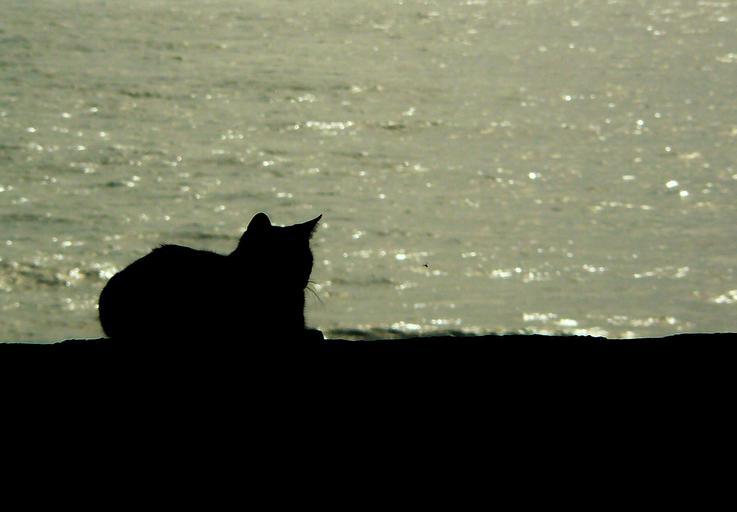 Keywords: cat animal black cat black domestic cat animal world close animal portrait animals back light silhouette atmospheric mirroring reflections sea coast water mediterranean wall