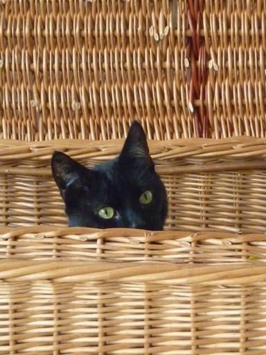 Keywords: cat basket black curious attention hidden