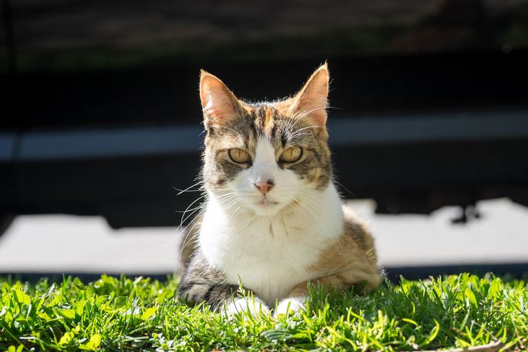 Keywords: cat face portrait pet domestic feline cute eyes head close up looking resting kitty furry grass outdoors tabby