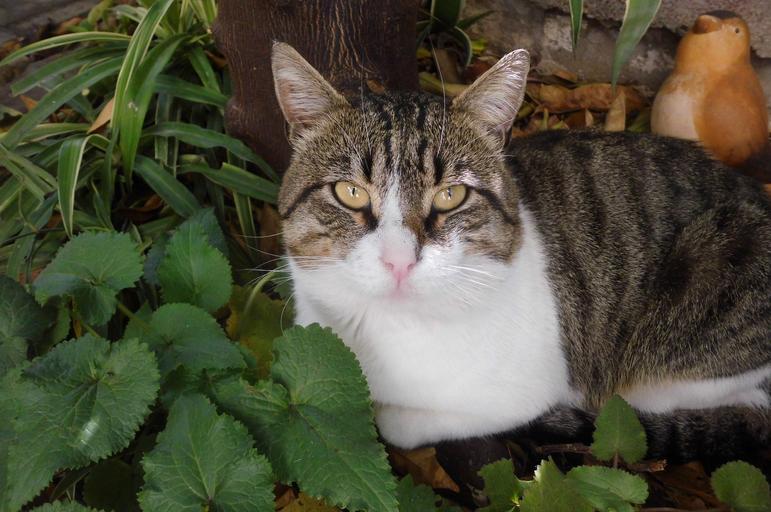 Keywords: cat face portrait pet garden domestic feline cute eyes head close up looking resting kitty furry plants outdoors tabby