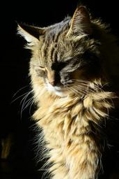Keywords: cat in the sun sunlight cat feline animal domestic cute nature fur portrait summer sleeping relaxation pet bright head sunset face eyes closed black background whiskers long haired tabby