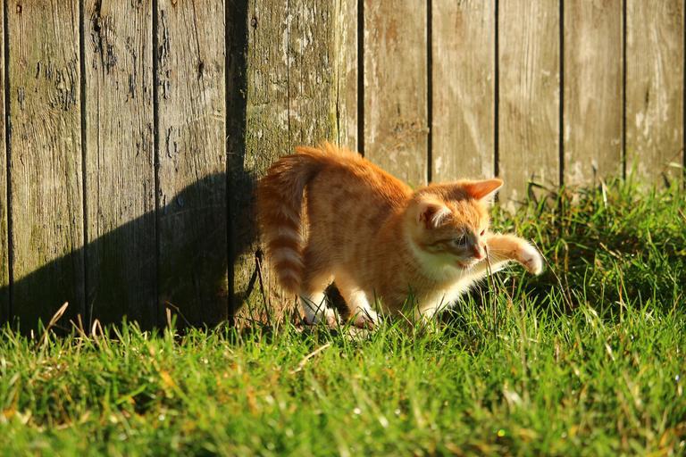 Keywords: cat kitten red mackerel tabby cat baby young cat red cat grass wooden wall