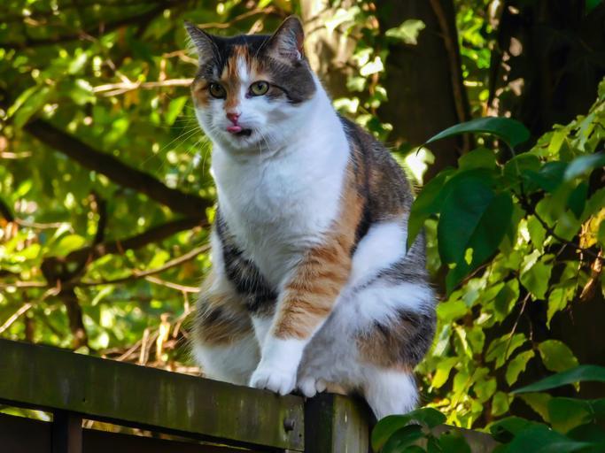 Keywords: cat lucky cat fence tongue balance three coloured domestic cat mieze cat face sit squat lick attention watch observation fur