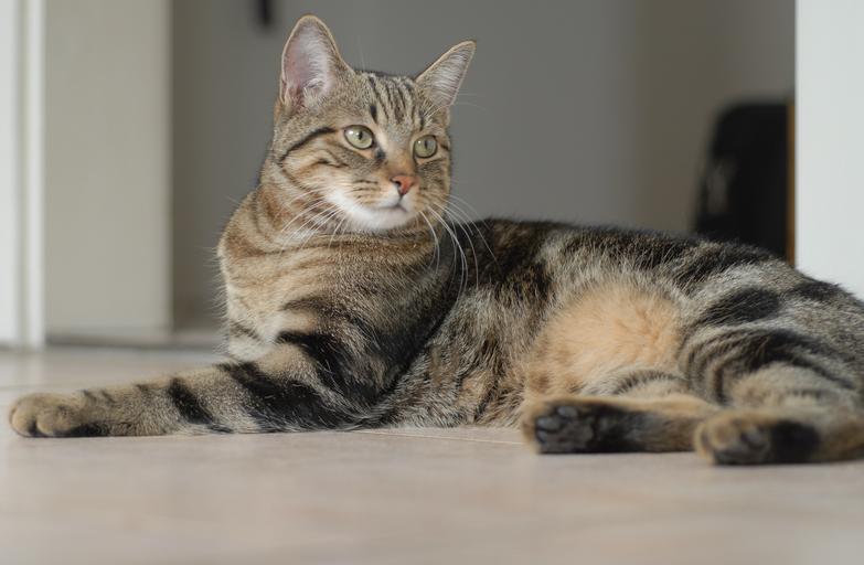 Keywords: cat portrait pet domestic feline cute shorthair looking resting kitty furry indoors tabby relaxing