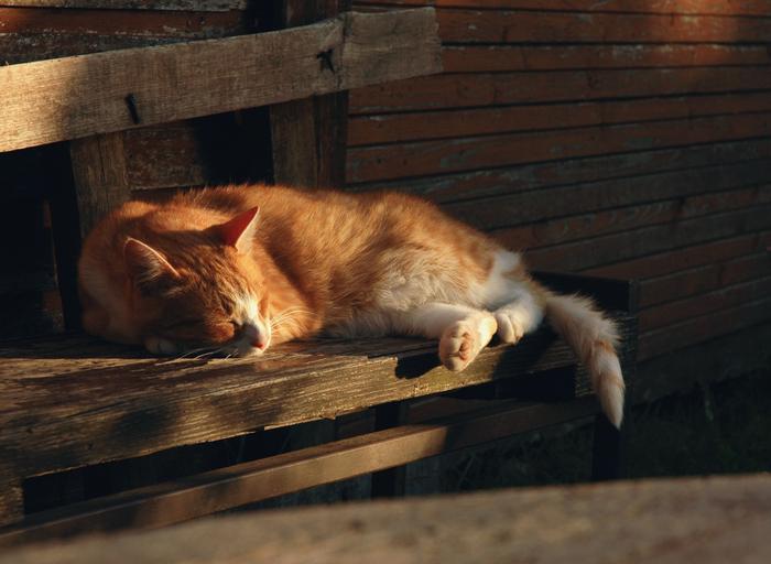 Keywords: cat rest cute pet animal relax kitten sleep sleeping calm lazy striped wall bench