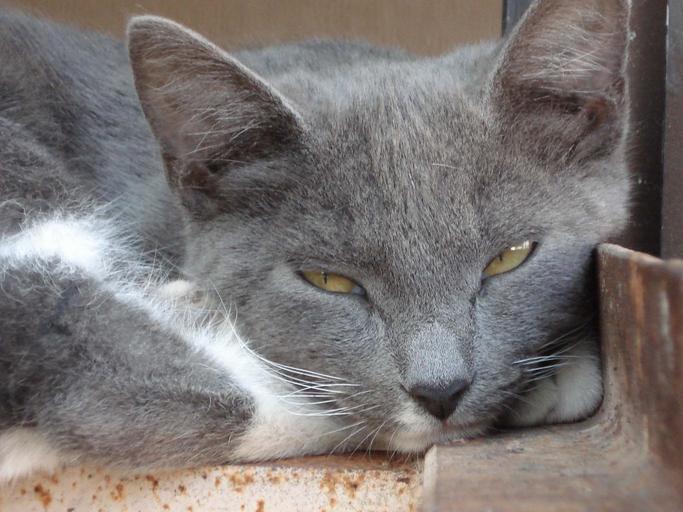 Keywords: cat sleep grey feline pet outdoors homeless sad