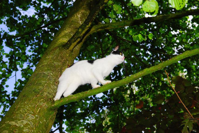 Keywords: cat tree climb young cat pet nature cat in the tree domestic cat in the free curious playful animal animal world black and white fur adidas