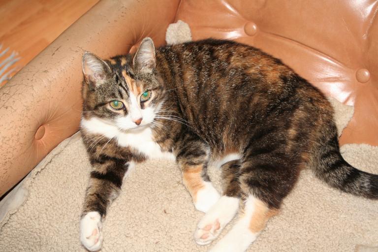 Keywords: Cat with striped fur.jpg Emppu-kissa 2006-07-21 own assumed Tepi-7 Domestic cats Black tortoiseshell tabby and white cats