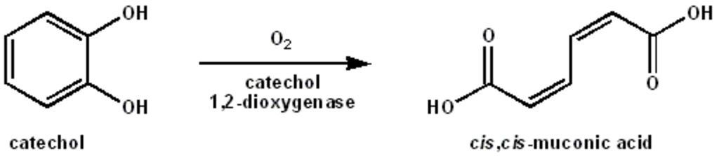 Keywords: Catachol-dioxygenase-reaction.png The substrate and product of catechol 1 2-dioxygenase 2006-03-27 own assumed Scienthomas Enzyme reactions Pyrocatechol Muconic acid