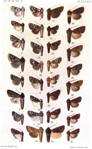 Keywords: CATALOGUE-BM-PLATE LXXXVI.jpg en PLATE LXXXVI 1 Discestra florida m Vol V p 15 Florida H10257 Trichoclea florida Sm 1900 2 Craterestra semifusca f p 22 Uganda 3 Scotogramma hadeniformis f p 30 Colorado H10237 Trudestra hadeniformis Sm 1894 4 Anarta etacta f p 41 Alaska H10330 Sm 1900 5 Polia naevia m p 65 Colorado H10381 Lacinipolia naevia Sm 1898 6 P languida m p 69 Colorado H10280 P purpurissata Grt 1864 7 P griseata f p 74 Colorado H10381 Lacinipolia naevia Sm 1898 8 P gnata m p 86 Arizona H10375 Lacinipolia gnata Grt 1882 9 P dilatata f p 118 New Mexico H10416 Lacinipolia illaudabilis Grt 1875 10 P variolata m p 118 Washington H10326 Miselia variolata Sm 1888 11 P glaciata m p 119 Arizona H10325 Miselia glaciata Grt 1882 12 P roseosuffusa m p 189 Arizona H10389 Lacinipolia roseosuffusa Sm 1900 13 P vittula f p 183 New Mexico H10380 Lacinipolia vittula Grt 1882 14 P incurva m p 184 New Mexico H10373 Lacinipolia incurva Sm 1888 15 P intentata m p 184 Colorado H10379 Lacinipolia umbrosa Sm 1888 16 Chabuatta punctosa m p 264 Australia 17 Hyssia sminthistis m p 280 New Zealand 18 H niveiguttata m p 288 California H10575 Ulolonche niveiguttata Grt 1873 19 H orbiculata m p 289 Colorado H10574 Ulolonche orbiculata Sm 1891 20 H musculina m p 289 Syria 21 Proteinania achatioides m p 290 Brazil 22 Eriopyga crocosticta m p 292 Mexico 23 E mulina m p 293 Mexico 24 E baruna m p 294 Brazil 25 E mediorufa f p 295 Brazil 26 E contempta m p 295 Costa Rica 27 E curtica m p 296 Colorado H10546 Protorthodes curtica Sm 1890 28 E acalus f p 296 Colorado H10548 Protorthodes akalus Stkr 1898 29 E incincta m p 297 Colorado H10552 Protorthodes incincta Morr 1874 30 E perfusca m p 299 Mexico 31 E melanopis m p 299 Arizona H10566 Protorthodes melanopis Hamp 1905 32 E orobia m p 299 Texas H10565 Protorthodes orobia Harv 1876 CATALOGUE OF THE NOCTUIDAE IN THE COLLECTION OF THE BRITISH MUSEUM Sir GEORGE F HAMPSON Bart 1903-1913 PD-old Catalogue of Lepidoptera Phalaenae in the British Museum Vol 4