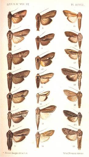 | Keywords: CATALOGUE-BM-PLATE XCVIII.jpg en PLATE XCVIII 1 Cucullia lilacina m Vol VI p 67 Mexico H10196 Schaus 1898 2 C asteroides m p 68 New York H10200 Gn 1852 3 C postera f p 69 New York H10198 Gn 1852 4 C obscurior f p 70 Colorado H10197 C florea Gn 1852 a obscurior Sm 1892 5 C similaris m p 71 Colorado H10195 Sm 1892 6 C arizona f p 71 Arizona H10204 Sm 1905 7 C perstrigata f p 72 Mexico H10204 C arizona Sm 1905 8 C convexipennis m p 72 New York H10202 G R 1868 9 C stigmatophora f p 73 Punjab 10 C scrophulariphila m p 75 Spain 11 C anceps m p 77 Armenia 12 Empusada argyrina m p 86 Chili 13 E hutchisoni m p 87 Natal l4 E argentivitta m p 87 Cape Colony 15 E pyrostrola f p 88 Transvaal 16 E ruficeps f p 88 Madagascar 17 E chrysotra m p 88 Natal 18 E pallidistria m p 88 Basutoland 19 E sabulosa m p 90 S Russia 20 Cucullia bistriga m p 68 Colorado H10209 Copicucullia eulepis Grt 1876 21 C terrensis m p 48 Cape Colony CATALOGUE OF THE NOCTUIDAE IN THE COLLECTION OF THE BRITISH MUSEUM Sir GEORGE F HAMPSON Bart 1903-1913 PD-old Catalogue of Lepidoptera Phalaenae in the British Museum Vol 4 |