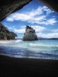 Keywords: cathedral cove new zealand sea ocean water waves rocks sky clouds beach cave view