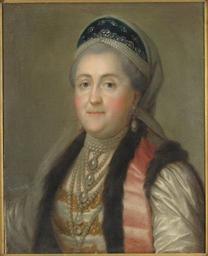 Keywords: Catherine II in Russian dress after V.Eriksen (priv.coll.).jpg Э иксен Ви гилиус масте ская По т ет импе ат ицы Екате ины II в кокошнике О игинал данного по т ета был создан известным датским по т етистом В Э иксеном около 1767 года и в 1768 году пода ен английскому в ачу Томасу Димсдейлу п ививавшему оспу самой импе ат ице и наследнику After Virgilius Eriksen Portrait of Catherine II Empress of Russia Catherine the Great wearing a traditional Kokoshnik and fur-trimmed bolero an embroidered dress and an elaborate pearl necklace Head and shoulders Oil on canvas 62 x 47cm; 24½ x 18½in Eriksen was appointed court painter to Catherine II and he painted several portraits of her The pastel original of this portrait no longer survives but several copies are known to exist mainly executed in the late 18th and early 19th Century One copy was given by Catherine in 1769 to Dr Thomas Dimsdale the English Doctor who discovered inoculation against small pox He travelled to Russia to inoculate the Empress and her grand children and this picture was later engraved in mezzotint by William Dickinson and published on June 20th 1773 in London Lined evidence of old damage in several places particularly upper right and lower left retouching in the affected areas http //www woolleyandwallis co uk/Lot/ sale PW121212-2 lot 454 id 236723 Конец 1760-х годов Э иксен Ви гилиус масте ская PD-old-100 Catherine II in Russian dress 1 Catherine II by Eriksen Files uploaded by Shakko from various sources Fur garments in art Private collections of Russian art PD-old |