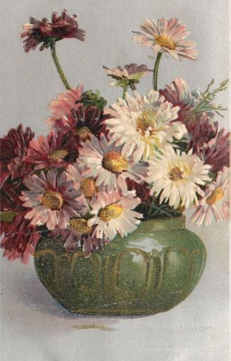 Catherine_Klein~Unsigned_Pink_Daisy_Flowers_in_Green_Pot~Silver_Back~Emboss~1908.jpg (983x1534)