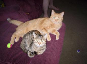Keywords: Cats Sixx and Taz.JPG Two cats lying down on a recliner leg rest Mackerel tabby cats Two cats