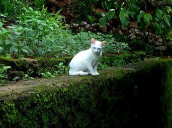 Keywords: cats white kitten animals mammals baby young small cute adorable single alone sitting wall stone walls watching green plants flora fauna greenery leaves leafy wildlife domestic kitty pets