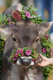 Keywords: cattle show customs appenzellerland appenzell stone calf beef award floral decorations floral wreath tradition agriculture ruminant switzerland