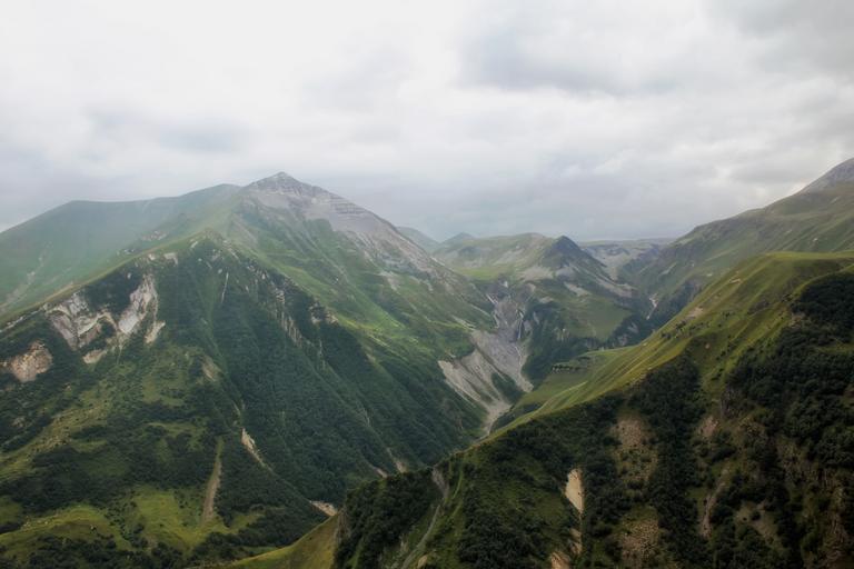 Keywords: caucasus mountains mountain range valley gorge ravine nature outside landscape scenic sky clouds mist cloudy countryside remote