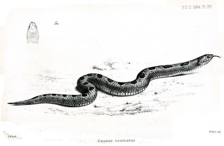 Keywords: CaususRostratusWolf.jpg Causus rostratus C defilippii Proceedings of the Zoological Society of London 1864 http //www archive org/stream/proceedingsofgen64zool page/n165/mode/1up web 1864 Creator Joseph Wolf PD-old-100 Causus defilippii Joseph Wolf PZSL 1864 |