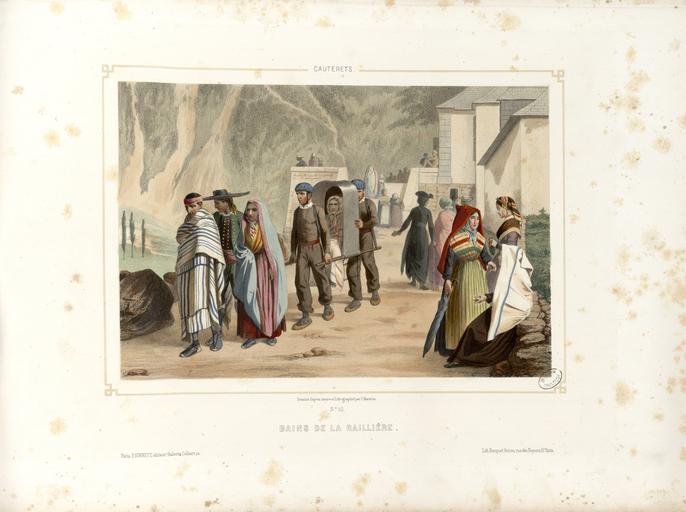 | Keywords: Cauterets - Bains de la Raillière - Fonds Ancely - B315556101 A MONTAUT 025.jpg Titre calligraphié et illustré à l'encre sur feuille de calque Fait partie de deux albums réunis et publiés par F Sinnett à Paris Lith de Becquet frères à Paris Les planches du premier album ont été dessinées par Montaut et lithographiées par Bargue Les planches du second album ont été dessinées et lithographiées par Charles Maurice Le titre du premier album est lithographié Le premier album est signalé dans la bibliographie pyrénéiste de Jacques Labarère comme étant très rare Pièce jointe photocopie en n et b d'une lithographie de Montaut intitulée Col de Tortes - Traversée de la montagne Ancely René 1876 - 1966 Possesseur fre public domain domaine public B315556101_A_MONTAUT_025 jpg image/jpeg 1 f de pl lithogr ; 30 cm oblong Sinnet F Éditeur Becquet 18 - 18 ; imprimeur Lithographe http //numerique bibliotheque toulouse fr/collect/general/index/assoc//ark /74899/B315556101_A_MONTAUT_025 dir/B315556101_A_MONTAUT_025 jpg A-MONTAUT 22 Ch Maurice http //catalogues toulouse fr/web2/tramp2 exe/do_keyword_search/log_in setting_key BMT1 servers 1home query p001749 vignette http //numerique bibliotheque toulouse fr/collect/general/index/assoc//ark /74899/B315556101_A_MONTAUT_025 dir/B315556101_A_MONTAUT_025_thumb jpeg by 1852 Cauterets - Bains de la Raillière B315556101_A_MONTAUT_025 lithography - print - colors - color lithograph Women in art Capes Female clothing Vests Jackets Dogs in art Needlework Berets in art Dresses in art Discussions Trousers in art Aprons in art French national costumes Caps in art Crowds in art Hats in art Shoes in art Umbrellas in art Male clothing Roads in art Men in art Human-powered litters in art Cauterets Shawls Children in art |