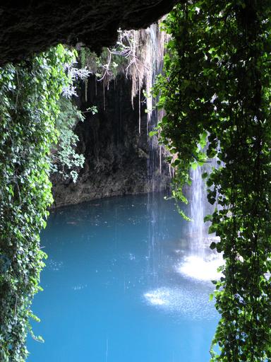 Keywords: cave waterfall ivy blue green