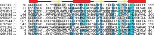 | Keywords: CBS domain alignment.png en Multiple sequence alignment of CBS domains Secondary structures are shown above with yellow arrows representing beta strands and red boxed alpha helices own Alexbateman 2011-04-14 Figure created using the belvu alignment viewer with additions using Illustrator Cc-zero Check categories 2011 April 15 en wikipedia CBS_domain 1 Protein domains Sequence alignment | ||||